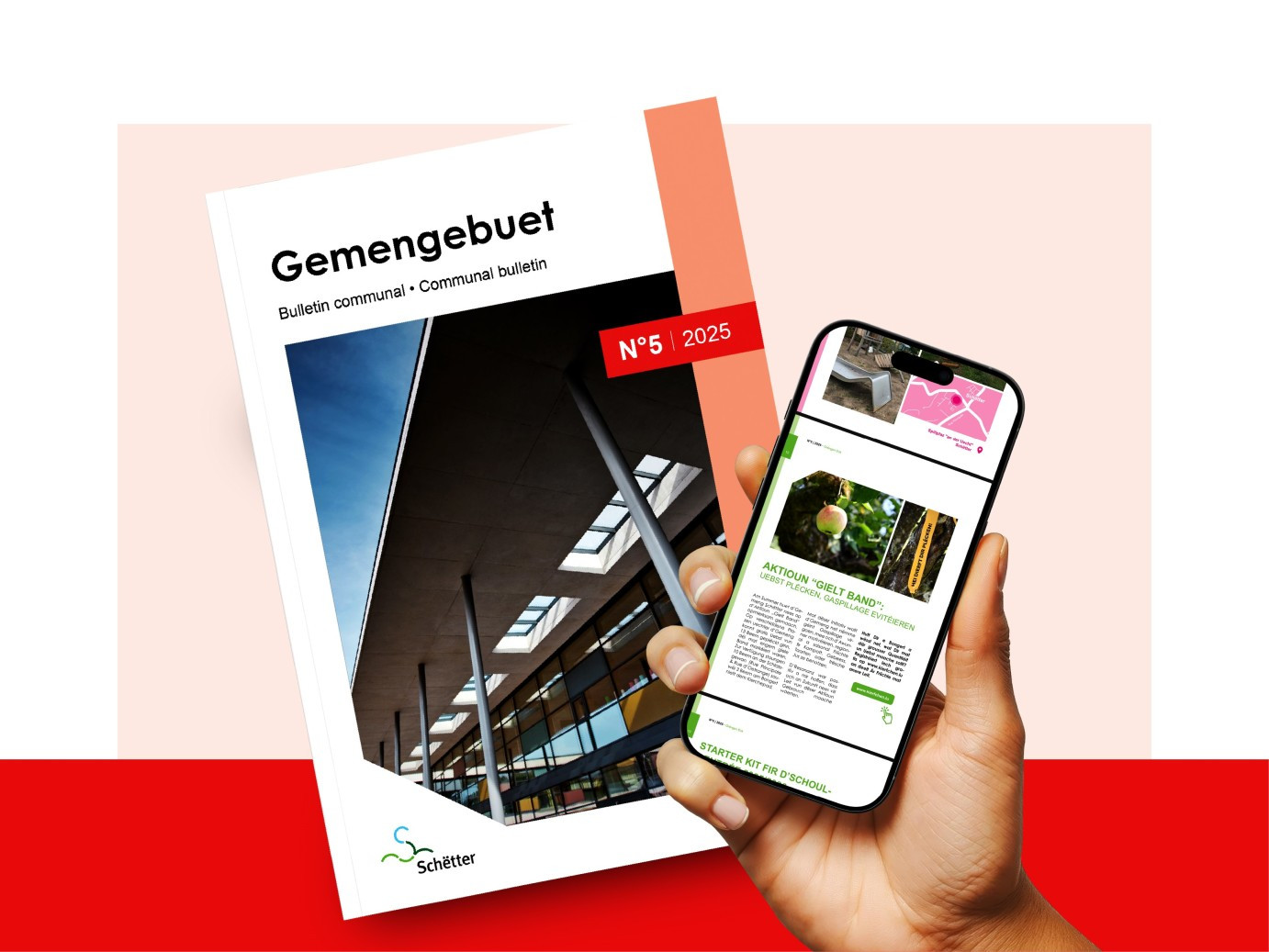 Bliedert gemittlech duerch de Gemengebuet 05/2025 an entdeckt interessant Artikelen zu aktuelle Projeten, bléckt mat eis zeréck op flott Eventer oder loosst d’Gemengerotssëtzung vu September nach emol Revue passéieren.