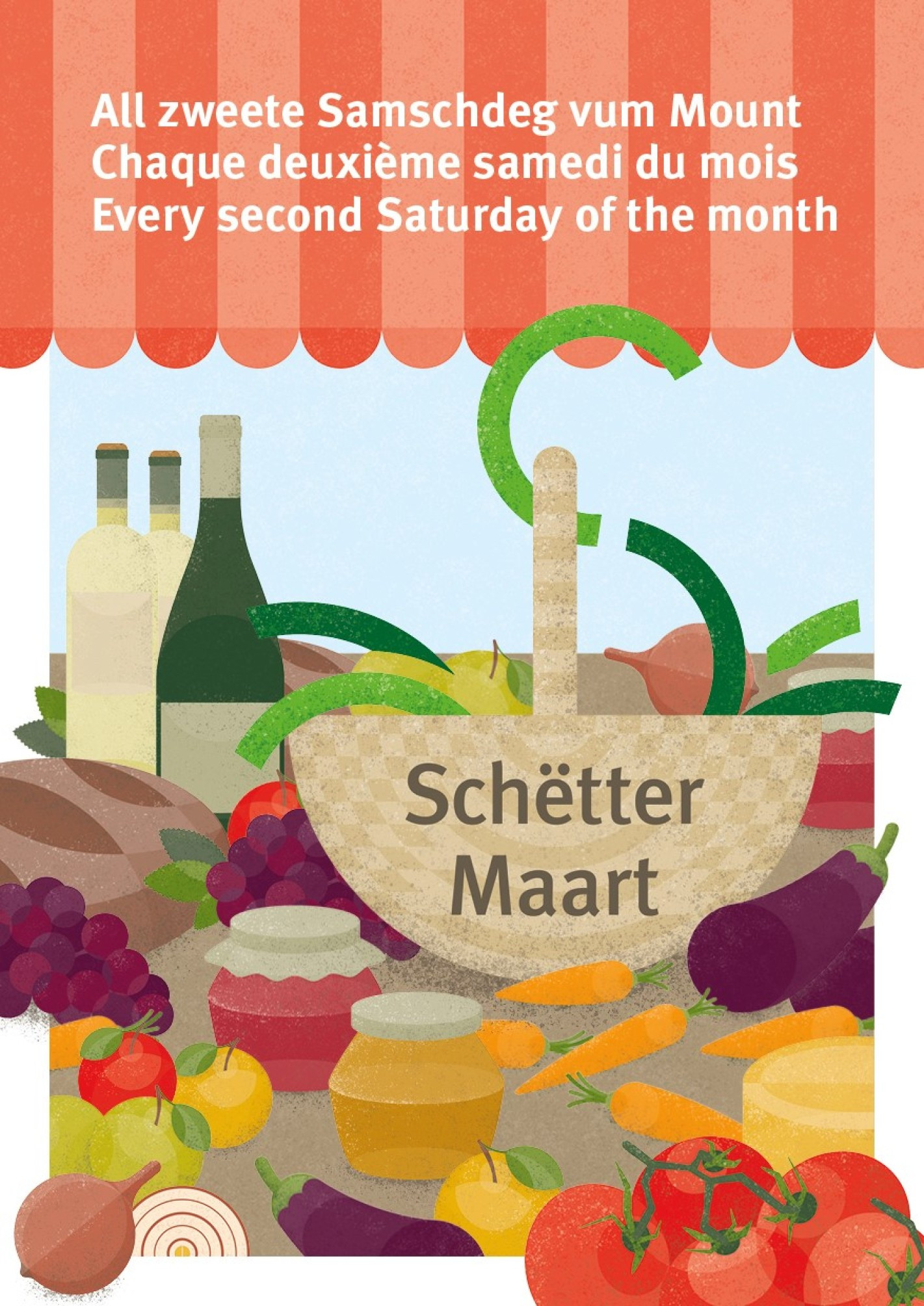 Kommt an entdeckt de Schëtter Maart, deen all 2. Samschdeg vum Mount vun 9.00 bis 13.00 Auer op der Kiercheplaz am Zenter vu Schëtter stattfënnt.
