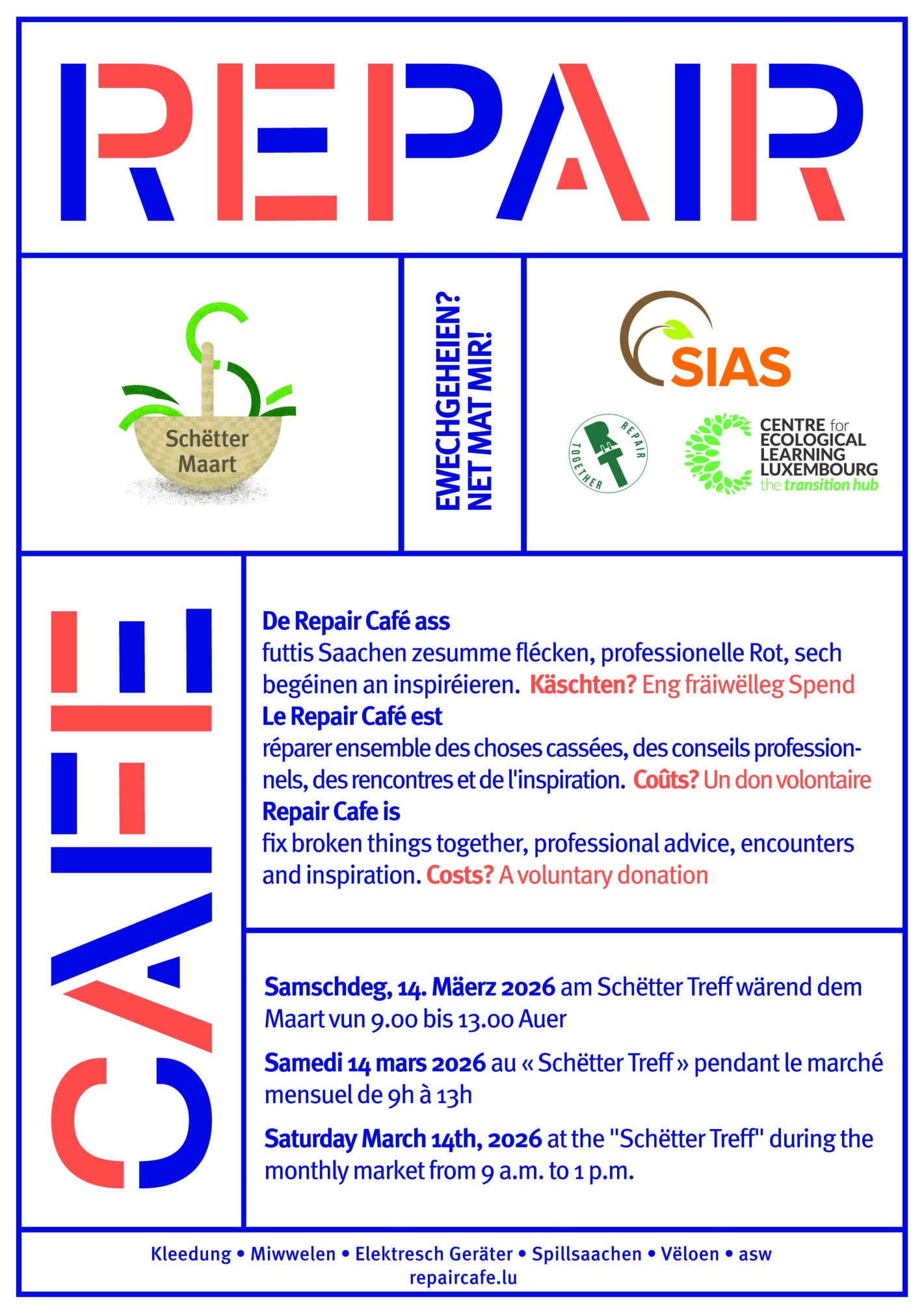 2026-03-13 23:00:00+00:00 09:30 13:00Repair Café am Schëtter Treff