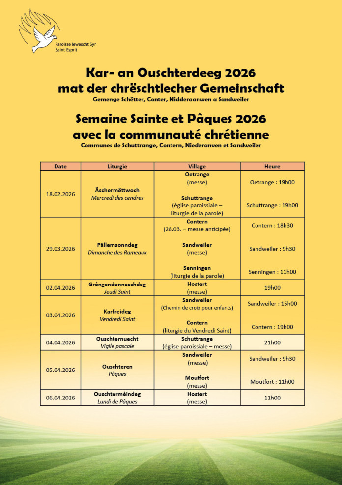 Kar- an Ouschterdeeg 2026 mat der chrëschtlecher Gemeinschaft